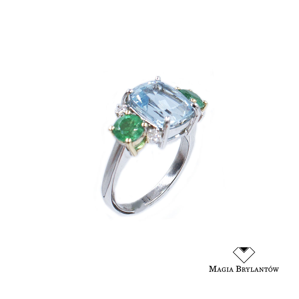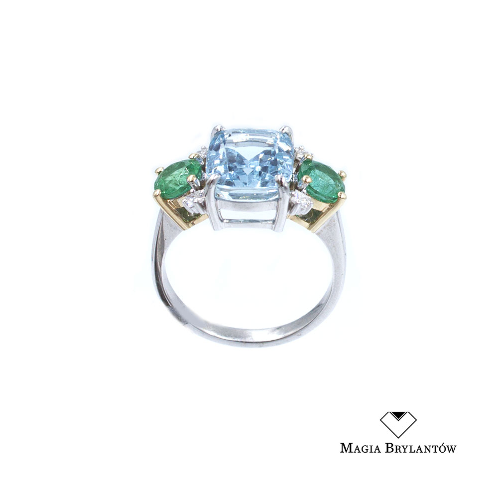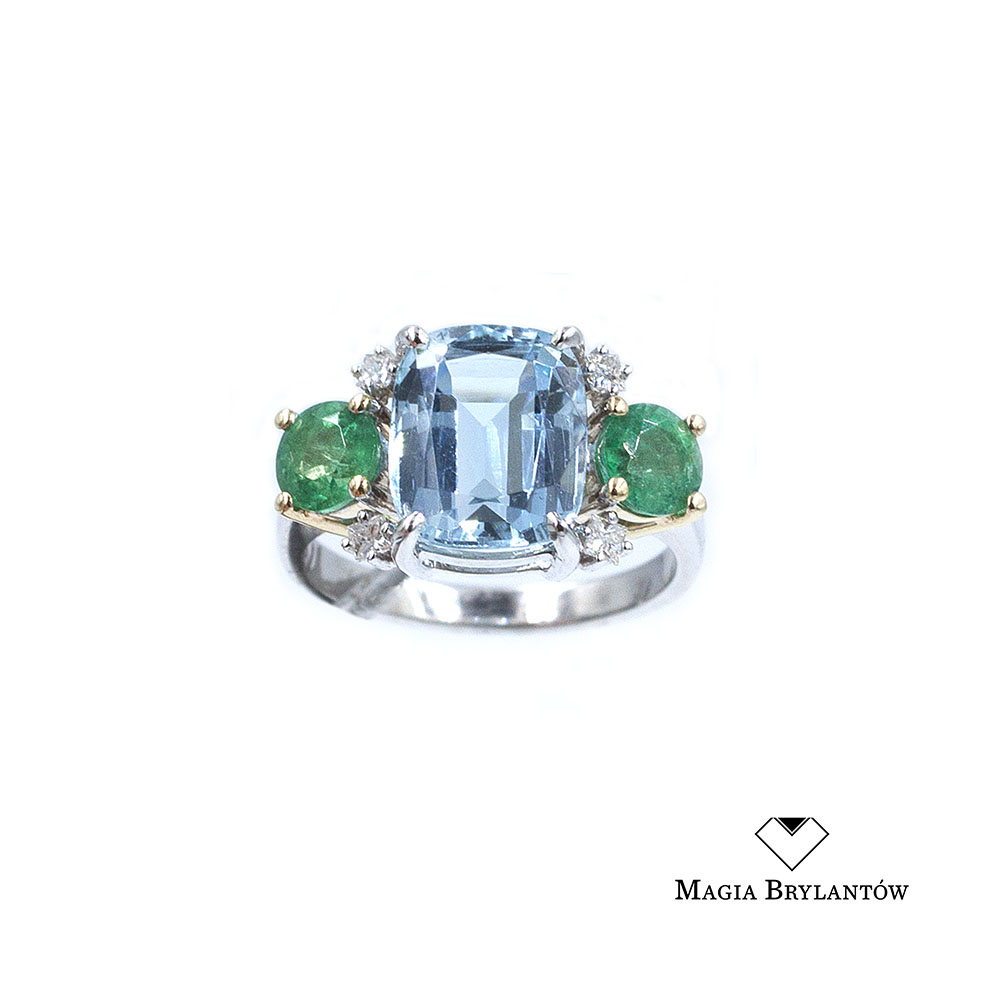 Kamienie: Akwamaryn 3.50ct, Szmaragd 1.09ct, Brylanty 0.07ct Vs/H